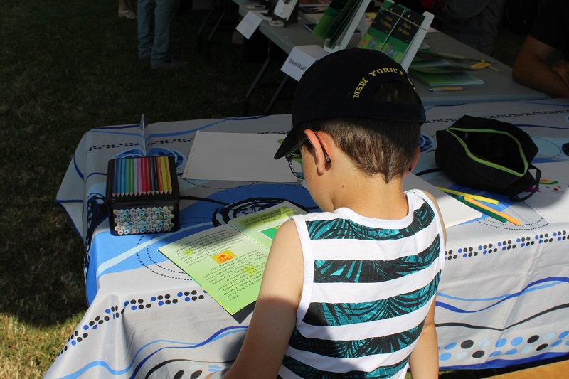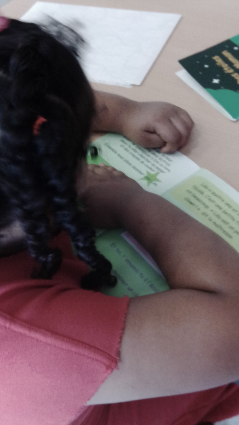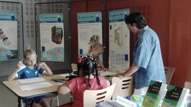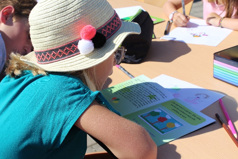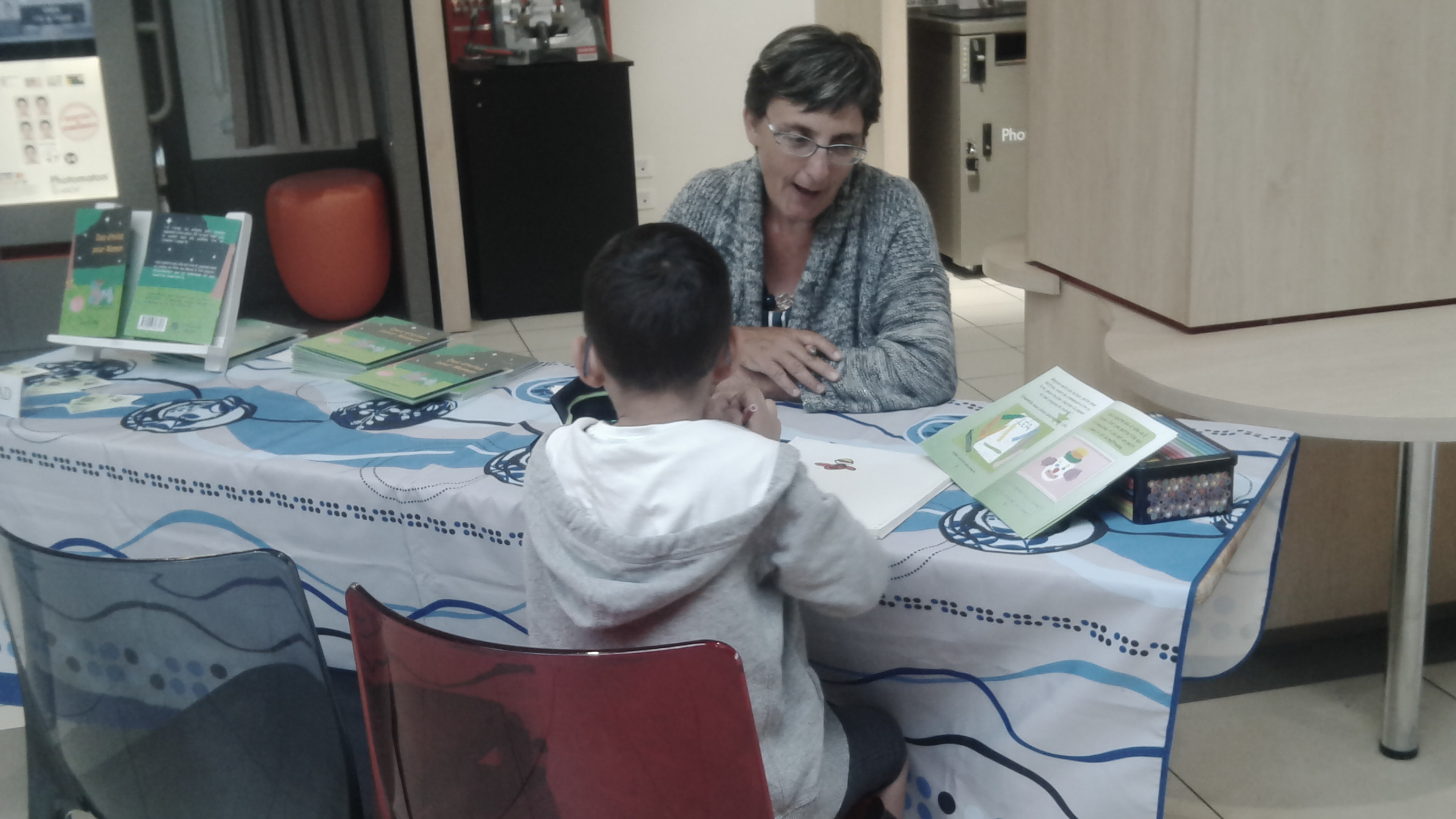 S'il y a eu peu de visiteurs en ce dimanche d'été, j'ai tout de même pu me régaler avec les quelques enfants qui ont participé à mon atelier lecture-dessin. La plus belle histoire de la journée : Maélyss, 7 ans, vient de finir son année de CP. Si elle a tout d'abord voulu dessiner, comme ses petits camarades, elle a ensuite commencé la lecture du livre. Elle a déchiffré une première fois la page de présentation puis elle a voulu la relire une deuxième fois. A la fin de cette deuxième lecture, elle m'a dit en souriant : « C'est ce qu'on a fait là ». Elle parlait bien sûr d'aller chercher des feuilles de papier et des crayons de couleur. Je lui ai ensuite demandé de relire une troisième fois. Sa lecture était bien plus fluide, elle faisait bien les liaisons. Elle a bien noté le son « ec » de lecteur et lectrice et la « ay » de crayon. Objectif de ma journée atteint.