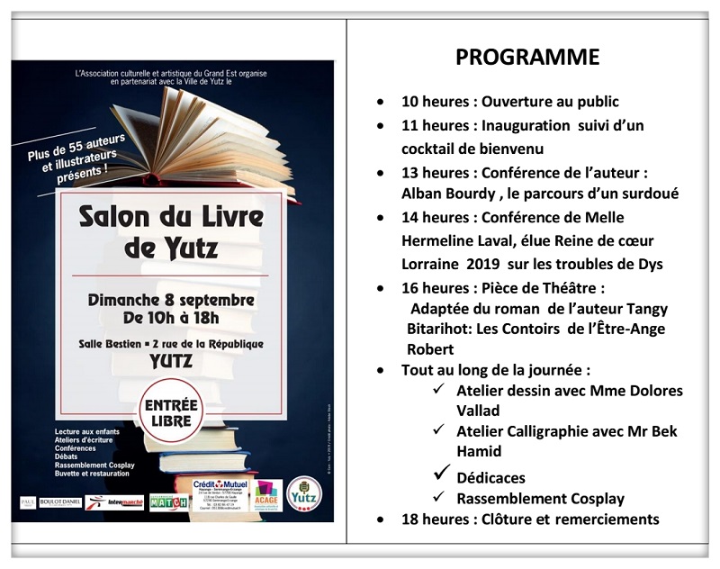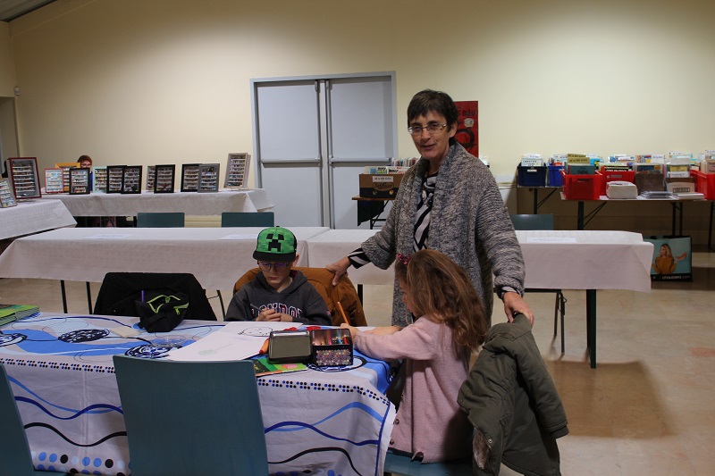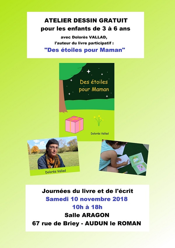 Le salon du livre d'HagondangeCe week-end, plus de 50 auteures (que des femmes) présentent leurs livres à la salle des fêtes au salon organisé par la commune mais en collaboration avec la libraire Hisler-Even de Metz.Si peu d'enfants ont visité le salon ce samedi, le public s'est prêté de bon cœur à l'exercice de dessin. Des ados et de nombreux adultes ont retrouvé le plaisir de dessiner à l'appui du livre « Des étoiles pour maman ». Comme Léa ils ont dessiné un arbre et leur animal préféré (chats, chiens, oiseau, dauphin, poule, serpent, chouette, cochon, cheval….)..JPG) .JPG)