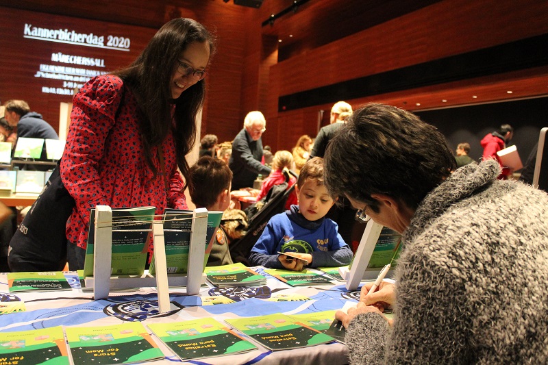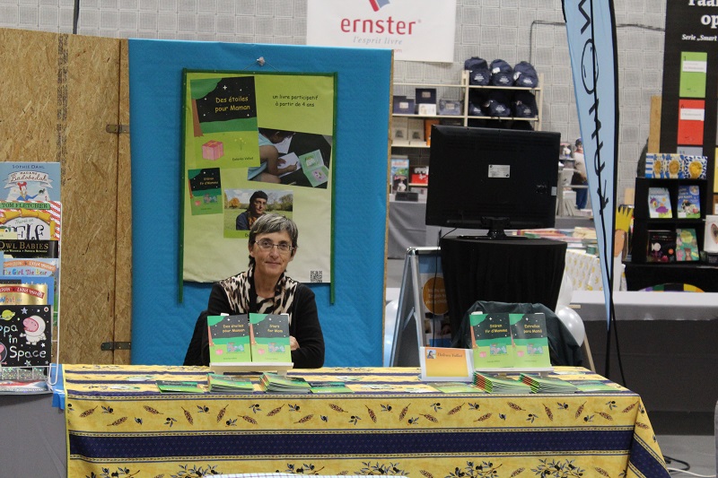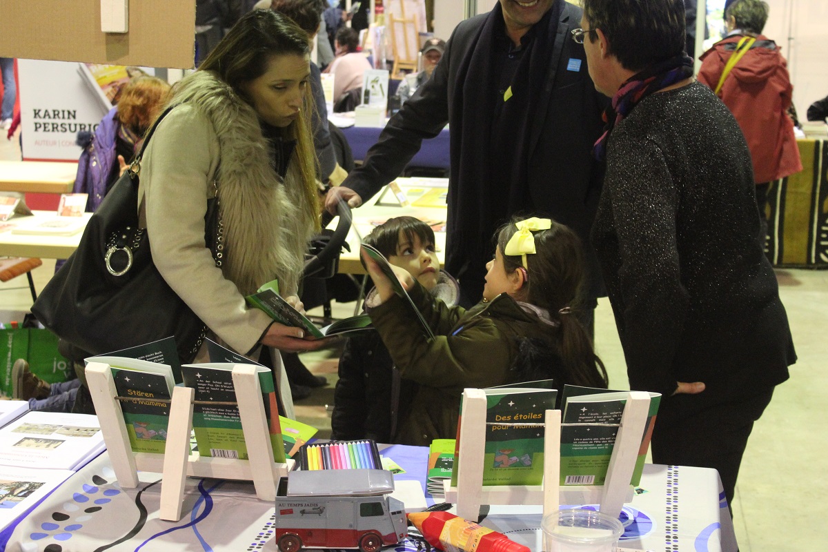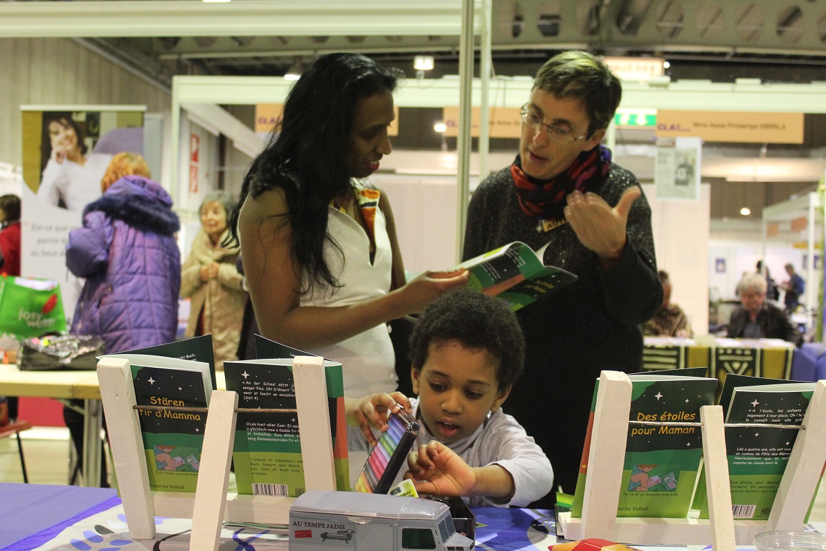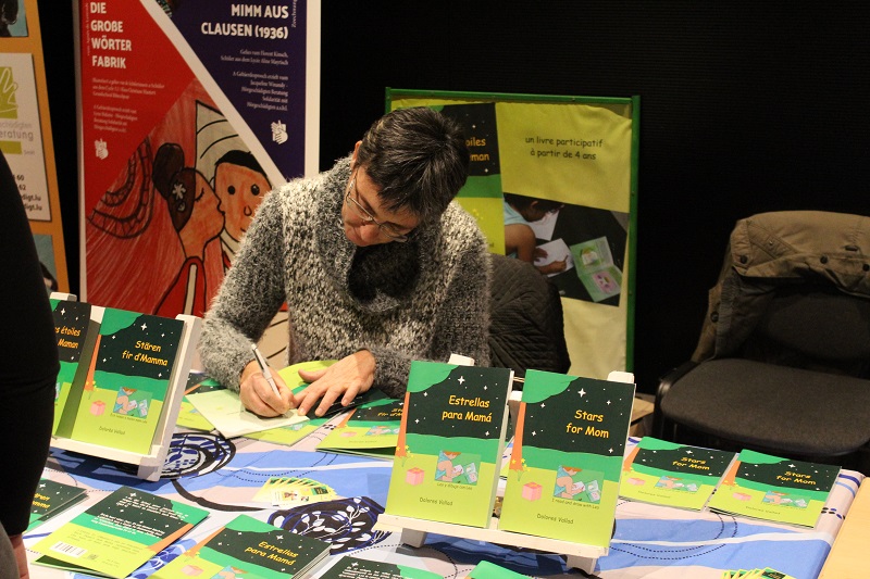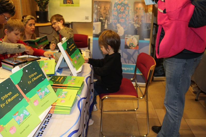 Le salon de Dudelange au Luxembourg hier, que du bonheur. Il était réservé aux enfants et des centaines d'entre eux sont venus acheter des livres. Qu'on ne dise pas que les enfants d'aujourd'hui ne veulent pas lire. Pas tous en tout cas. Pour ma part, j'ai eu plein de plaisirs. Des étoiles pour Maman a plu dans les quatre langues. En ce qui concerne "Estrallas para Mamá", la version espagnole, des parents colombiens, mexicains et honduriens ont été heureux de trouver un livre dans leur langue de naissance pour leurs jeunes enfants, même si dans chacun de ces pays ils ne parlent pas exactement le même espagnol. Un enfant insistait auprès de sa maman pour le prendre en espagnol. Une ado de 13 ans a choisi la version anglaise parce qu'elle le débute au collège. Quand elle aura terminé de le lire, elle le donnera à la bibliothèque de sa commune. Un gamin a choisi aussi "Stars for Mom". Quelques petits, à l'aise avec le français, ont pris la version originale et de nombreux enfants luxembourgeois ont préféré "Stären fir D'Mamma". J'ai même retrouvé un enfant qui m'avait déjà acheté le livre dans un autre salon. En passant devant mon stand, il a dit, souriant en montrant mes livres: "On l'a déjà celui-là". D'après sa maman, il l'a bien lu et a fait tous les dessins avec plaisir. Du plaisir pour eux et pour moi.