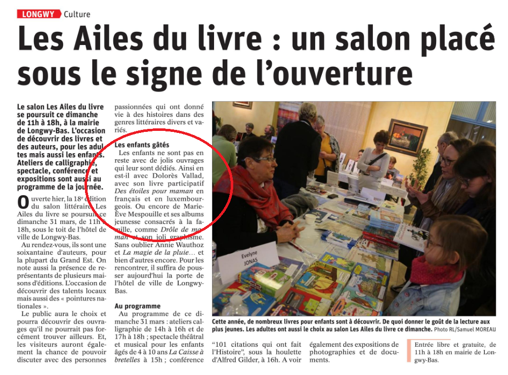 Des rencontres formidables dans ce salon du livre de Piennes. Mes petits visiteurs ont pris plaisir à ma table. Les parents et grands-parents ont apprécié le livre « Des étoiles pour Maman » qui continuera sa vie dans les mains de leurs enfants.