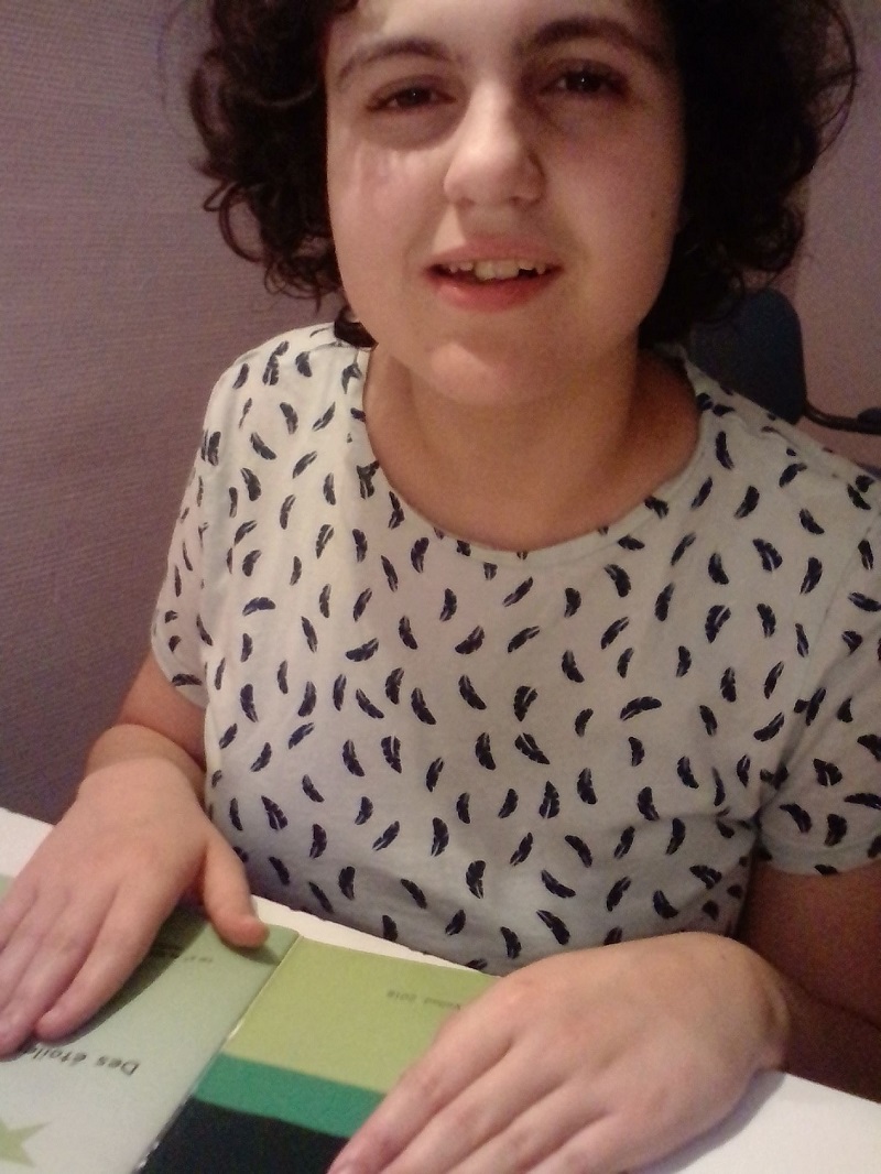 Julianne, une jeune autiste de 17 ans, fait ma connaissance en regardant ma photo et celle de la petite Léa en lisant « Des étoiles pour Maman » avec Olga, une des bénévoles qui la suit. Julianne progresse pour la plus grande joie de sa famille et de ses aidants. Il y a peu, Julianne ne pouvait pas avoir un livre dans les mains sans l'abîmer. Olga lui avait photocopié mon livre pour pouvoir travailler avec. Je suis heureuse de regarder cette photo de Julianne avec « Des étoiles pour Maman » dans les mains. Bravo petite Julianne. Bravo aussi à Olga et tous les bénévoles sans qui Julianne n'aurait jamais fait tous ces progrès. Julianne est passionnée par les planètes et elle a dessiné des étoiles dans notre système solaire. Beau travail jeune fille !