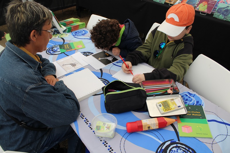 Cette rencontre avec mes jeunes lecteurs a été magique. Les regarder suivre la démarche du livre en dessinant, comme Léa, leur animal préféré ou le bouquet d'étoiles, cela m'a confortée dans l'idée que tout le monde aime dessiner, depuis Zoé, ma toute première visiteuse de 3 ans, à Mathias, l'ado de 14 ans qui pensait de pas aimer cette activité mais qui a fini par faire une jolie fleur. Formidable expérience à renouveler au plus vite! Voir toutes les photos