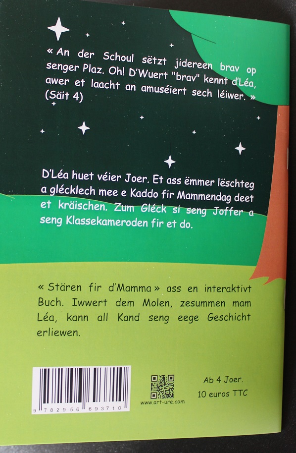 Vous êtes intéressés par la langue luxembourgeoise ? Vous souhaiteriez que vous jeunes enfants l'apprennent ? Mon livre est disponible en version luxembourgeoise sous le titre « Stären fir d'Mamma » dans deux librairies d'Esch-sur-Alzette. Il s'agit de la librairie ABC et de la librairie Diderich. Bonheur de voir mon livre dans ces belles librairies luxembourgeoises .