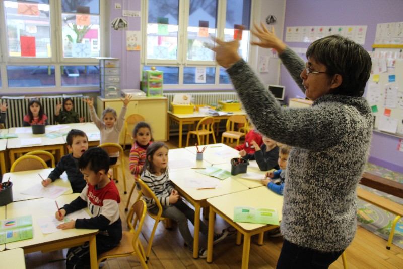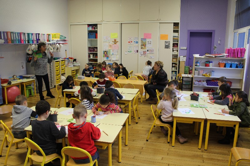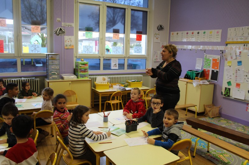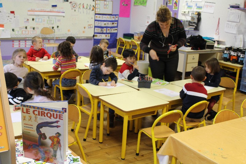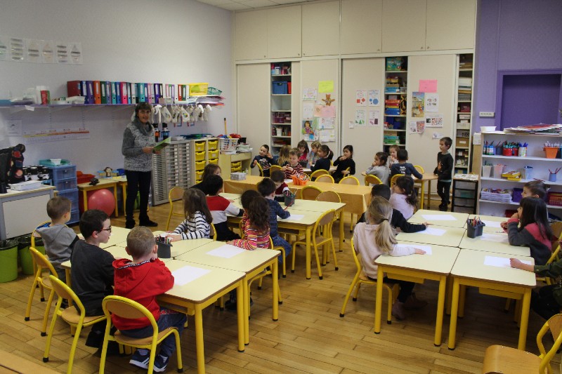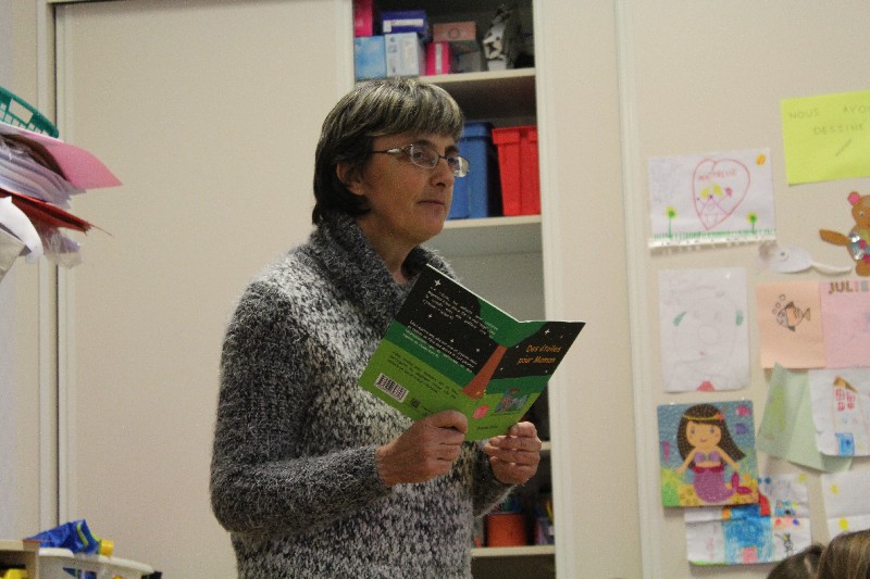 Léa à l'école maternelle de Sainte-Marie-aux-Chênes.Les enfants m'attendaient sagement à leur place. Ils savaient que je venais leur présenter mon livre.Le contact a été parfait. Ces petits, gentils, vifs et très participatifs, ont donné vie à ma petite Léa. Comme elle, ils ont dessiné, ils ont raconté leur propre histoire par le dessin et par les mots.Le thème de l'année dans leur classe est le cirque. Les élèves de l'école sont allés en voir un. Ils ont vu les clowns, les jongleurs, les dresseurs d'animaux. C'était parfait pour qu'ils participent à mon animation de ce jeudi matin. Quand j'ai demandé aux enfants s'ils pouvaient en dessiner un clown, tous les petits élèves en avaient déjà vu un. La maîtresse a guidé les enfants en leur rappelant au tableau que le clown se dessine avec des cercles, des triangles. Bravo pour cette intervention à la fois discrète et professionnelle.L'animal préféré de Léa a donné matière à une discution animée, chacun levant le doigt très haut pour annoncer l'animal qu'il aimait le plus. Le tigre que les enfants avaient vu au cirque a été cité un grand nombre de fois.Qui ne connait pas le petit escargot qui sort la tête quand il pleut dont parle ma petite Léa? Les petits ont chanté avec la maîtresse qui mimait les paroles. Les enfants ont compté, comme Léa également. Ils savent si bien qu'il a fallu les arrêter à 30. Je me suis régalée avec cette animation, la toute première dans une école. J'espère que j'aurais très vite d'autres occasions de présenter “Des étoiles pour Maman” à des jeunes élèves.
